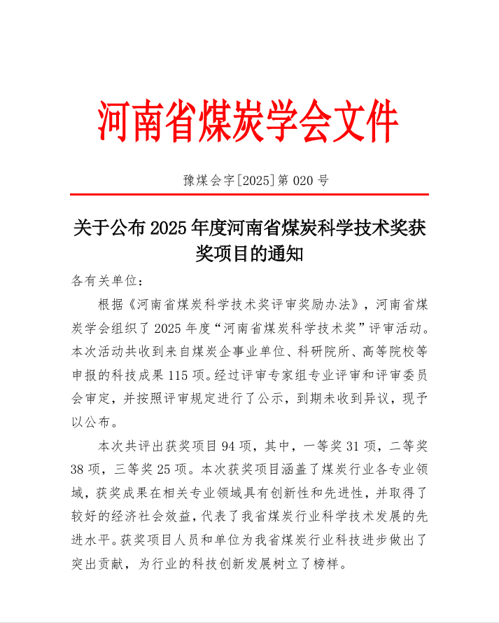 近日,河南省煤炭學會公布了2025年度“河南省煤炭科學技術(shù)獎”評審結(jié)果。由光力科技牽頭及參與完成的兩項科技成果光榮上榜,榮獲一等獎一項,二等獎一項。